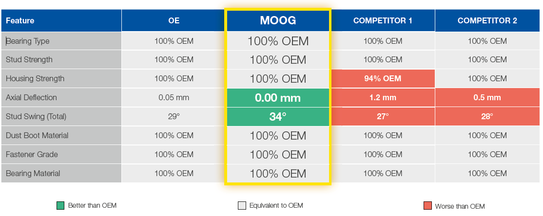 Extensive testing proved that MOOG® meets or exceeds the manufacturer’s Original Equipment (OEM) part in categories that are essential for inner tie rod ends. The complete results are listed in the comparative table.
