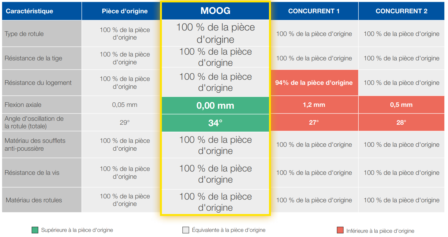 Des essais approfondis ont démontré que les pièces MOOG ont des performances similaires ou supérieures à des pièces concurrentes ou première monte. Les résultats complets sont détaillés ci-dessous.