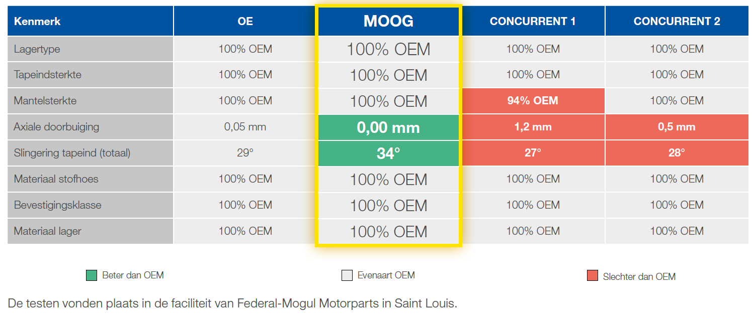 Uitgebreide tests hebben aangetoond dat MOOG de kenmerken van de originele onderdelen van de fabrikant (OEM) evenaart of overtreft in de categorieën die essentieel zijn voor stabilisator-verbindingsstangen. De volledige resultaten vindt u in de vergelijkende tabel.