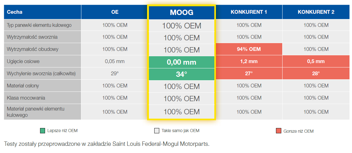Kompleksowe testy wykazały, że MOOG spełnia lub przekracza poziom jakości części wyposażenia fabrycznego (OEM) w kategoriach istotnych dla łączników stabilizatora. Kompletne wyniki można znaleźć w tabeli porównawczej.